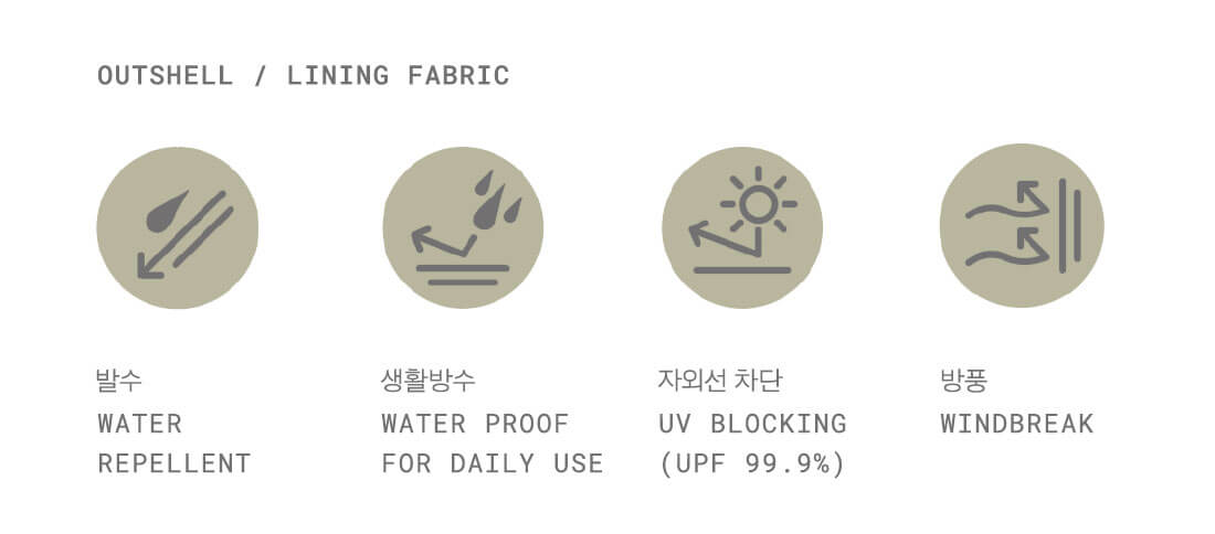 Taslan Nylon(Water proof for daily use / Wind Break / UV Blocking) / Thermore insulatation / Water repellent polyester lining