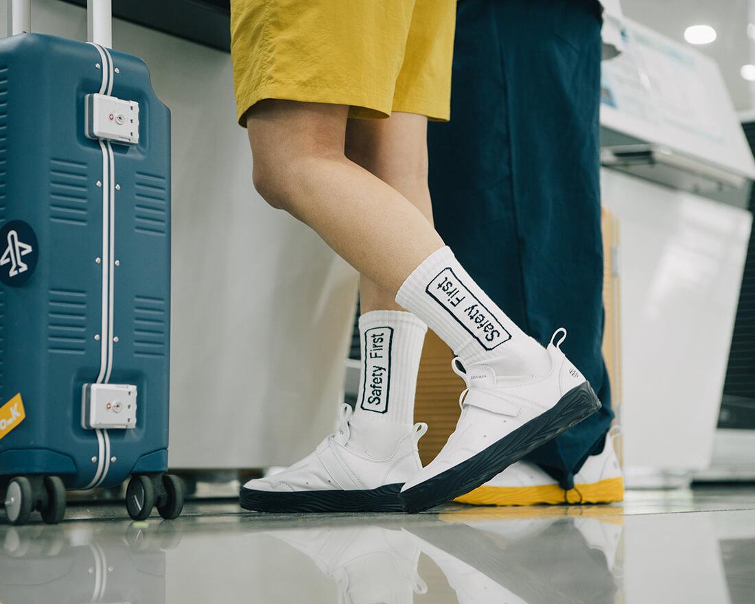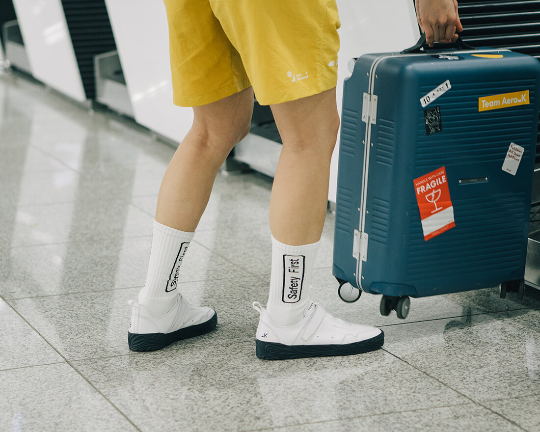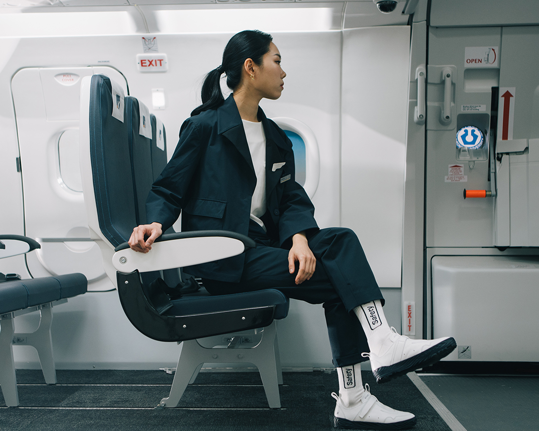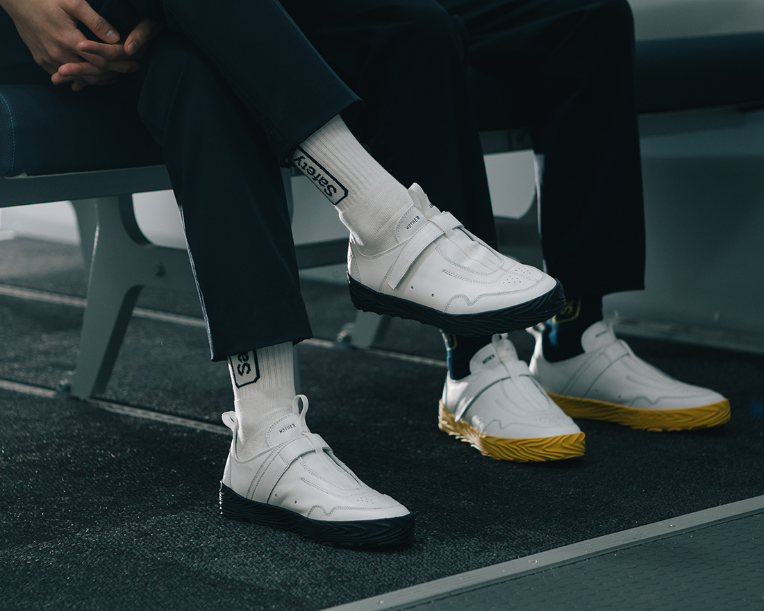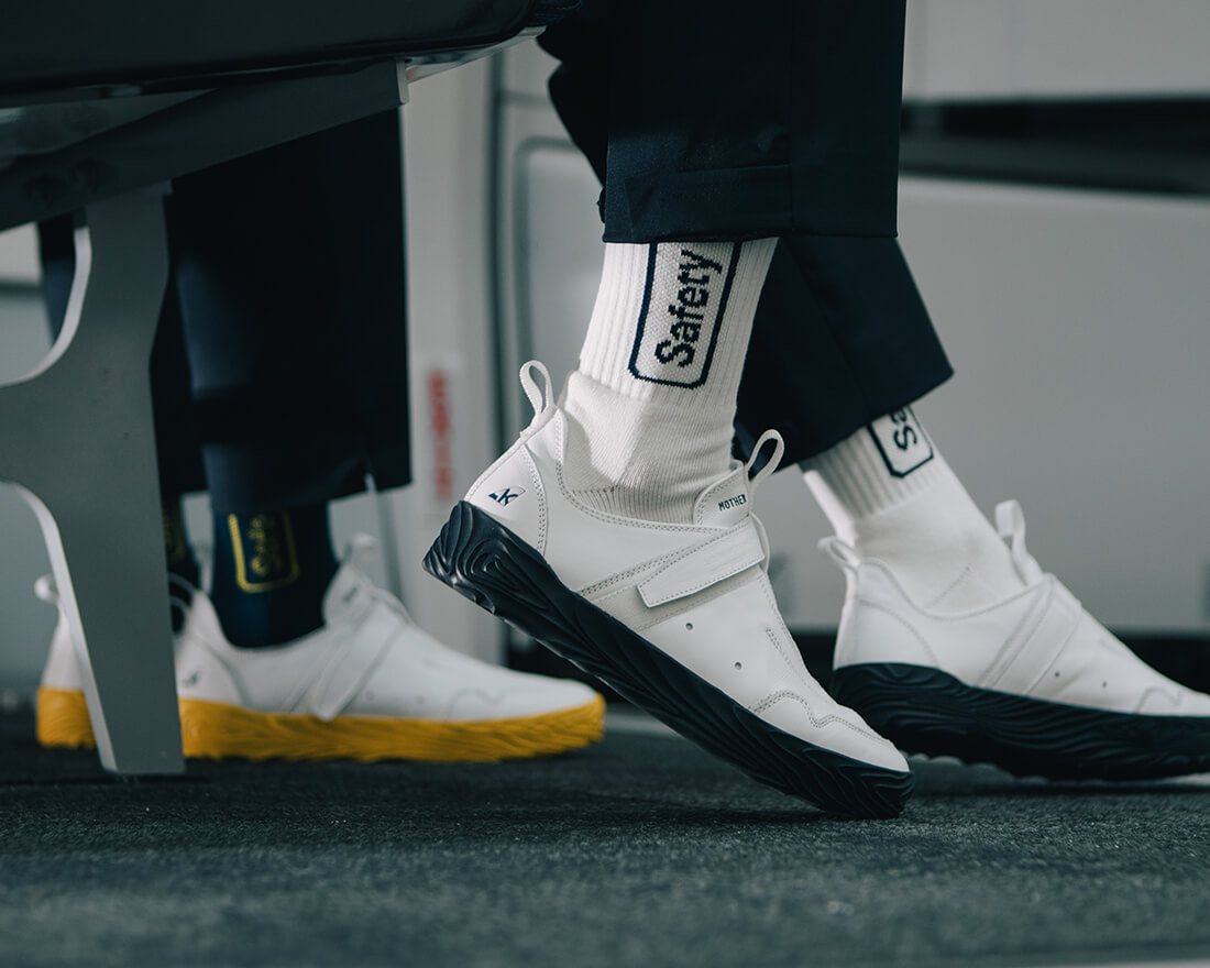 에어로케이가 마더그라운드와 선보이는 이번 유니폼화 또한 업의 본질과 근무 환경을 고려해 만들었습니다. 좁은 기내 환경에서 장시간 근무하는 특성에 맞춰 착화감과 콤팩트하게 구성된 기내 시설물과의 조합을 참고해 마더그라운드의 벨크로 타입 모델을 에어로케이 에디션으로 디자인했습니다. 운동화의 제작 취지는 신발에 각인된 ‘Safety First’와 벨크로에 각인된 기내 안전 메시지를 통해서도 확인할 수 있습니다.