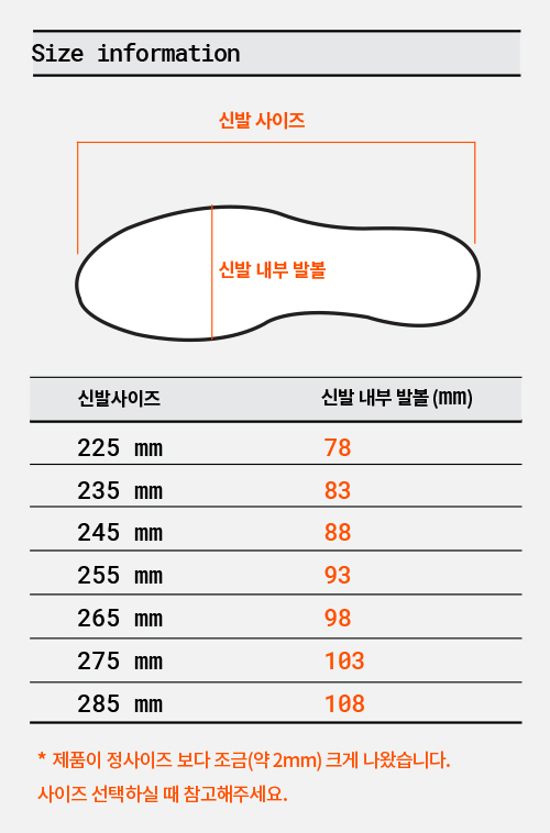 1. 여성분들의 경우 정사이즈보다 조금(약2mm) 크게 나온 것을 감안해주시기 바랍니다.