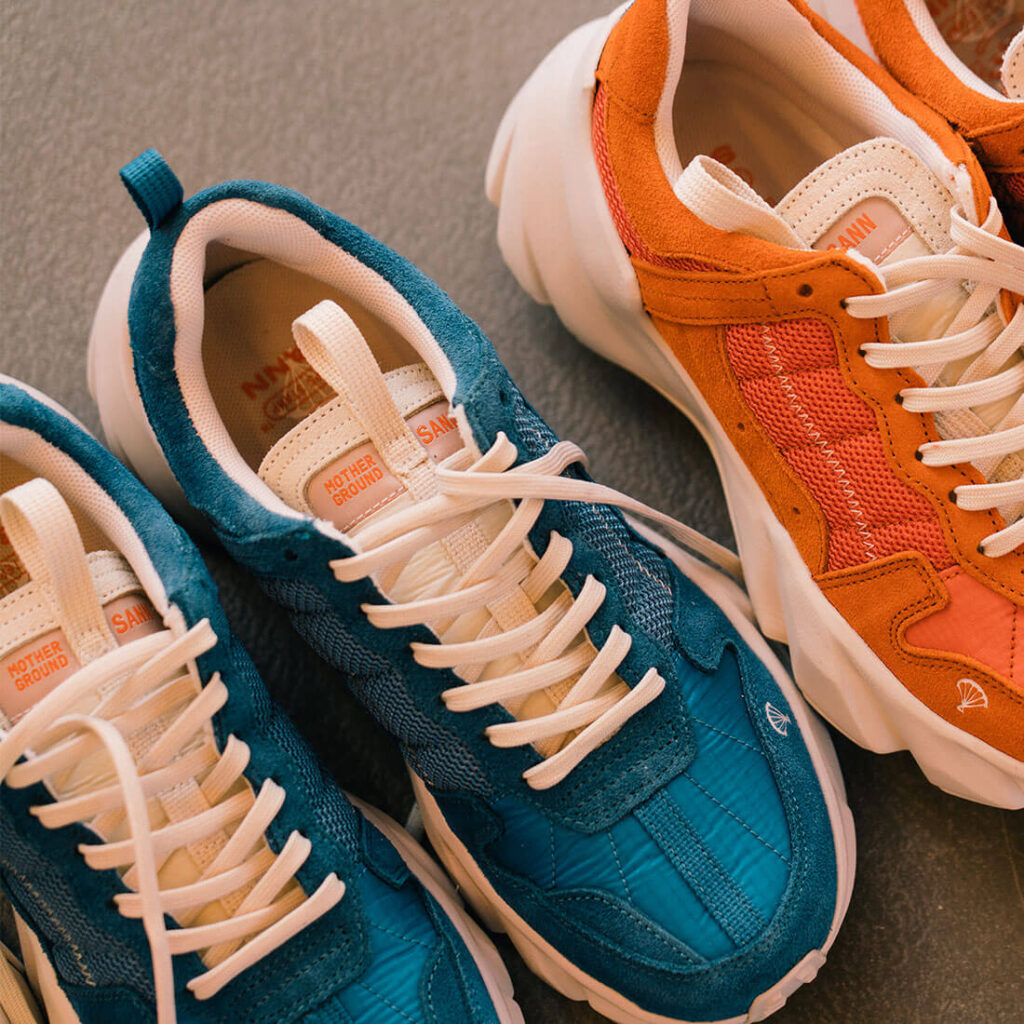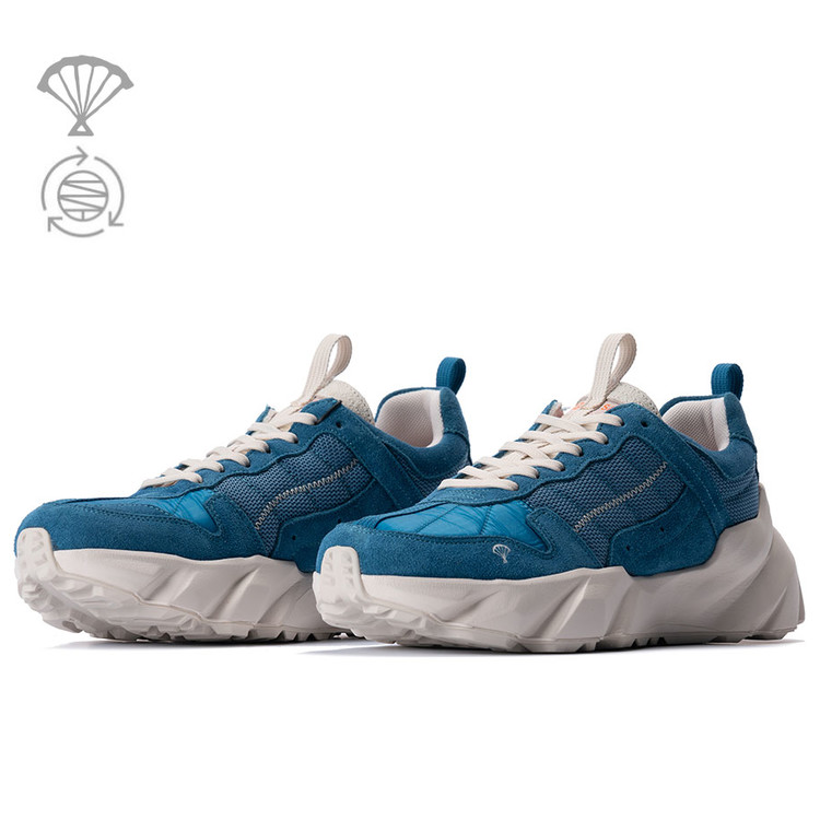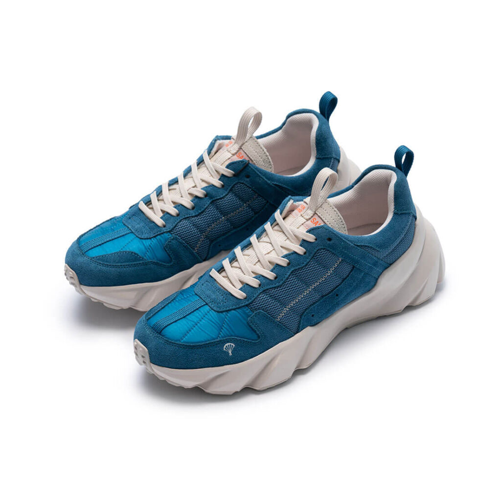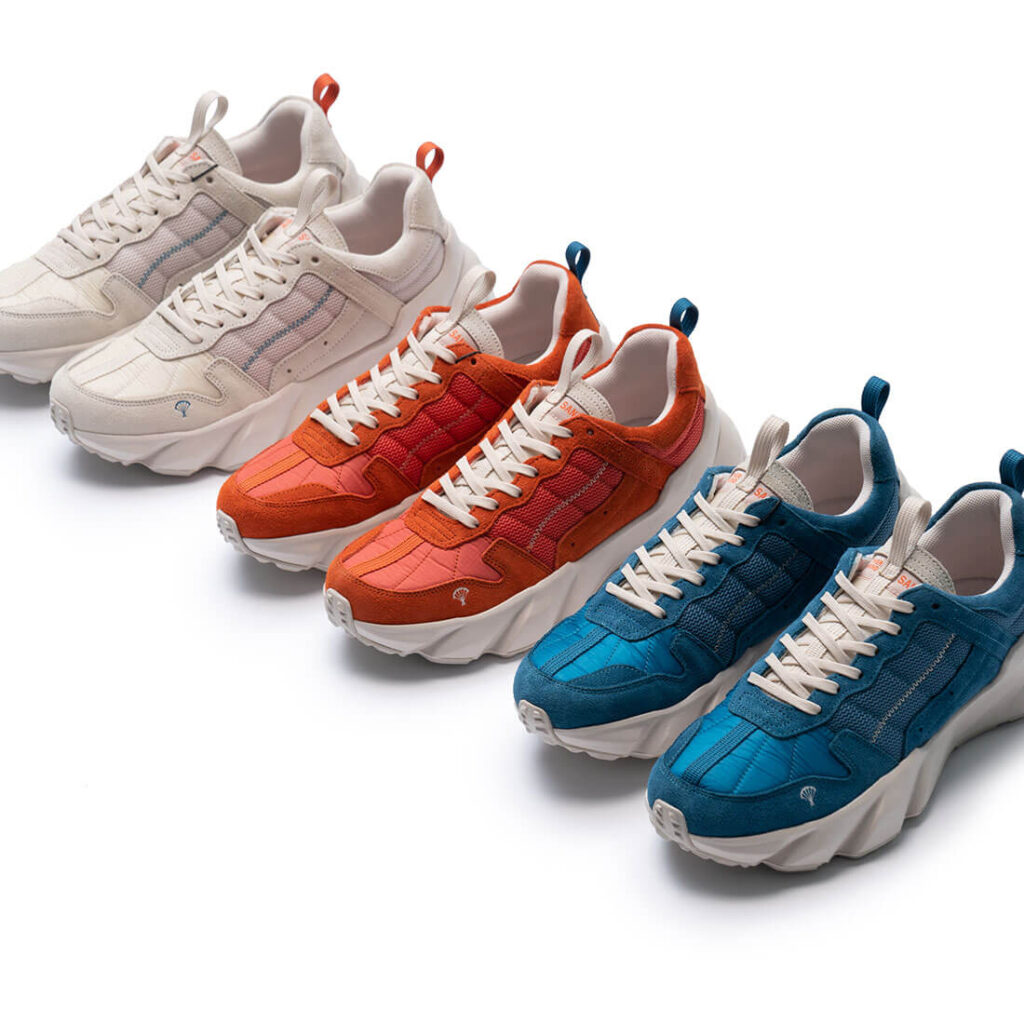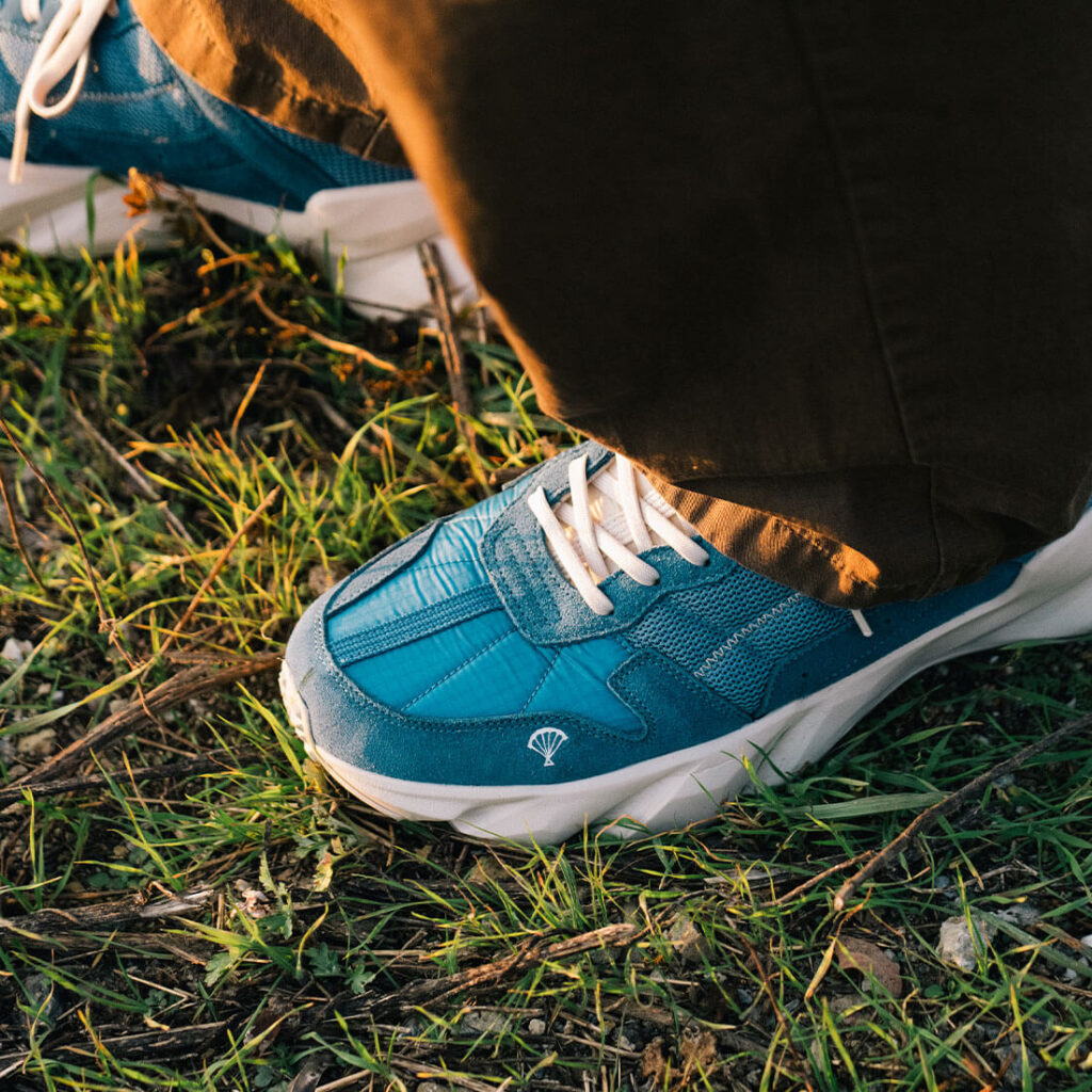 ‘산’에서 모은 수명이 다한 패러글라이더 원단을 이용해 만든 스니커즈입니다. 스니커즈의 베라(혀부분), 발등 부분에 패러글라이더 원단을 적용하였습니다. 일년에 수백개씩 버려지는 수명이 다한 패러글라이더 원단을 모아 깨끗하게 세척하고 재단한 원단입니다. 패러글라이더처럼 바람과 물에 강합니다.