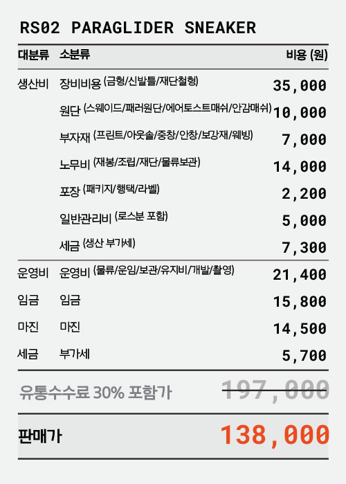 Cowhide-Suede / Used Paraglider Fabric (생활방수) / Recycled Polyester Shoelace / Injection Phylon Midsole / Rubber Outsole / EVA Insole